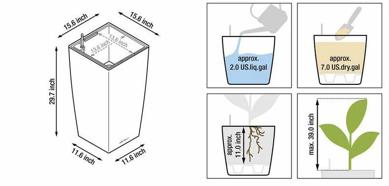 Dimensions ~ (W x H) 15.6 x 15.6 x 29.7 inch Water reservoir 2.0 US.liq.gal Plant volume 7.0 US.dry.gal Planter liner, dimensions 13.6 x 13.6 inch Planting depth 11.0 inch -