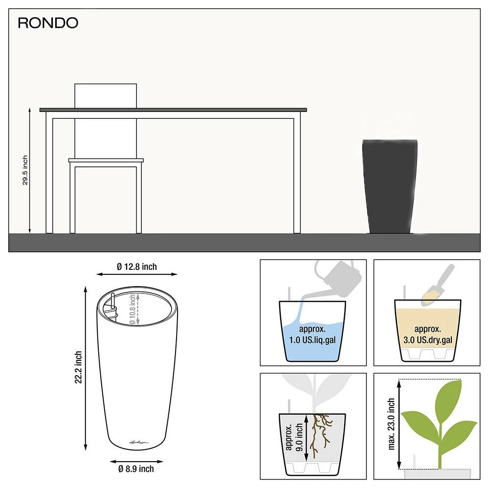 Dimensions ~ (W x H) Ø 12.8 x 22.2 inch Water reservoir 1 US.liq.gal Plant volume 3 US.dry.gal Planter liner, dimensions 10.8 inch Planting depth 9 inch -