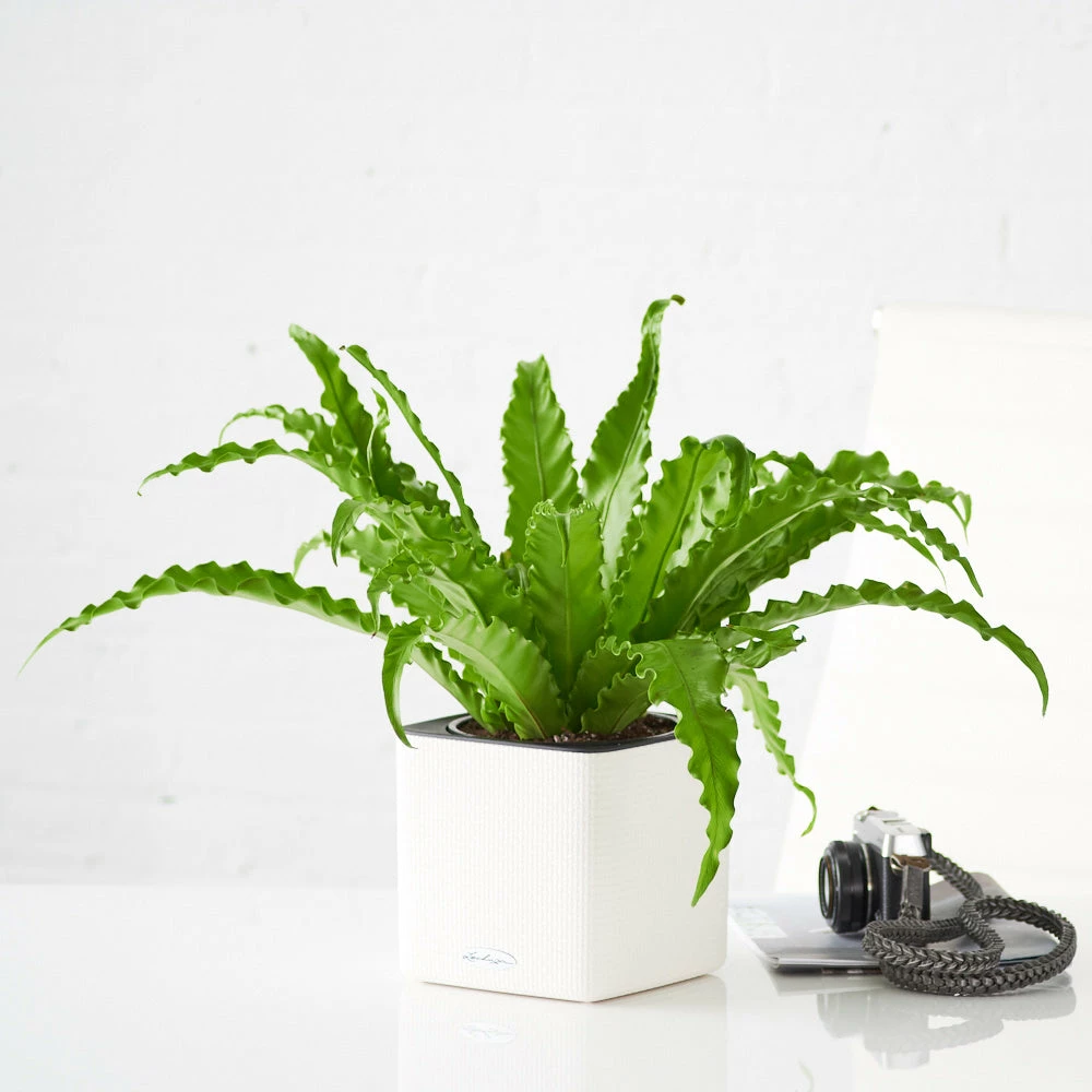 Bird’s Nest Fern is placed in an attractive and compact Lechuza Cube self-watering planter. This striking tropical plant is air cleaner and pet friendly.