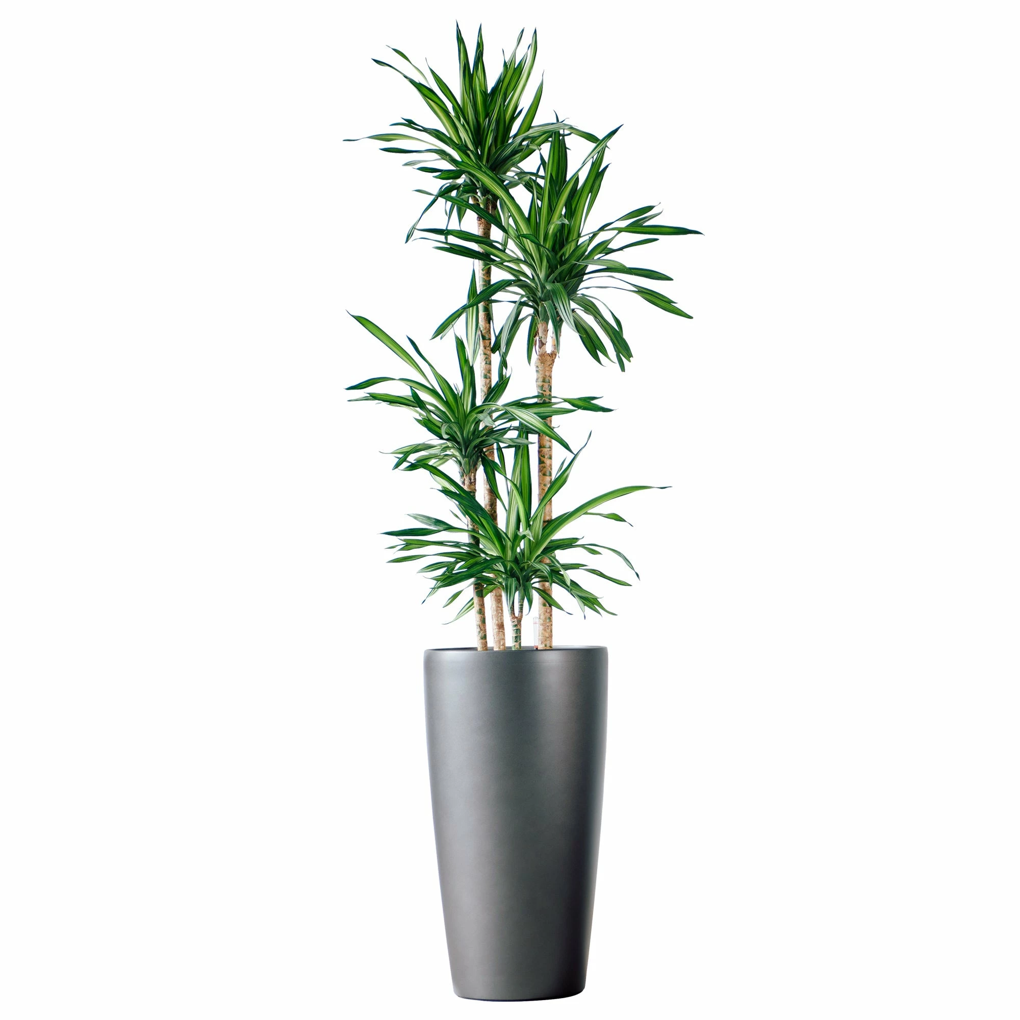 Dracaena Rikki is potted in a tall and elegant self-watering Rondo planter. This plant is relatively a new cultivar with dark green leaves and a yellow stripe running lengthwise down the center. It is a low-maintenance plant. Perfect choice for dressing up and brightening up large spaces.