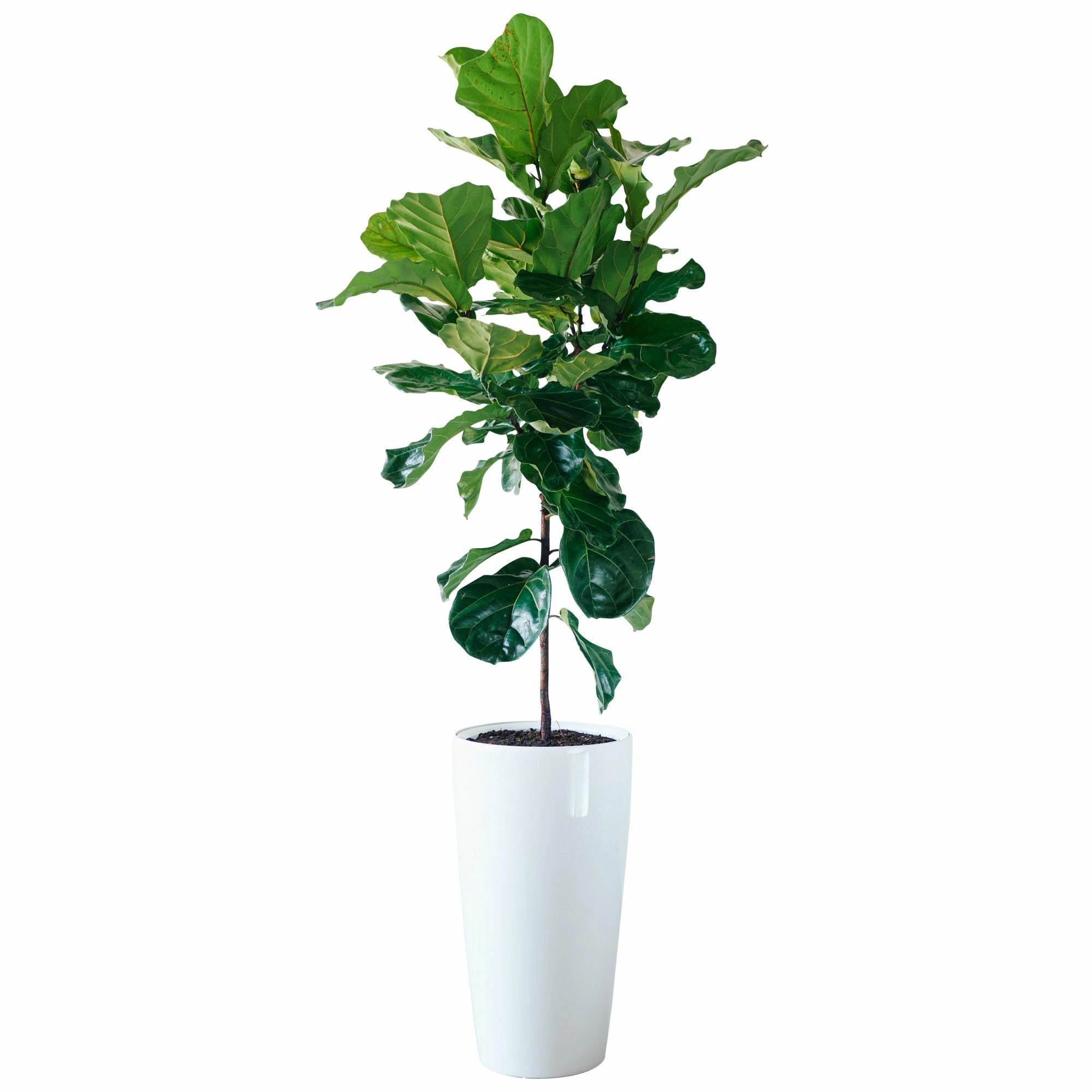 Ficus Lyrata. a.k.a. Fiddle Leaf Fig, is potted in tall and elegant self-watering Rondo planter. This combo creates a strong focal point. Large leaves, that are shaped like violins, make this plant a dramatic accent, and the number one plant choice to be photographed for interior and architectural magazines.