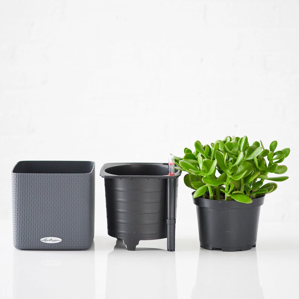Jade plant is placed in this attractive and compact Lechuza Cube self-watering planter. This plant is believed to be a money and fortune magnet. 😀