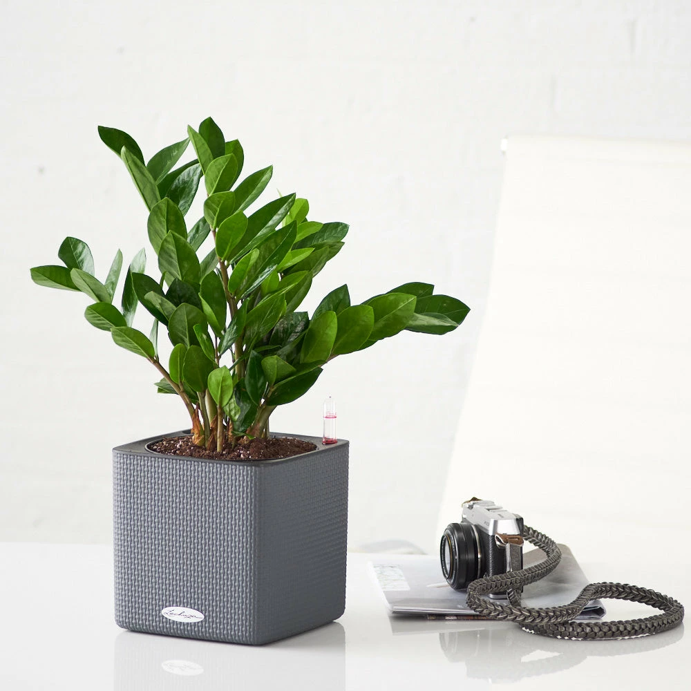 ZZ plant is placed in this attractive and compact Lechuza Cube self-watering planter. This one can take months of neglect and still look amazing. Also a great air purifier. Perfect match for a busy person.