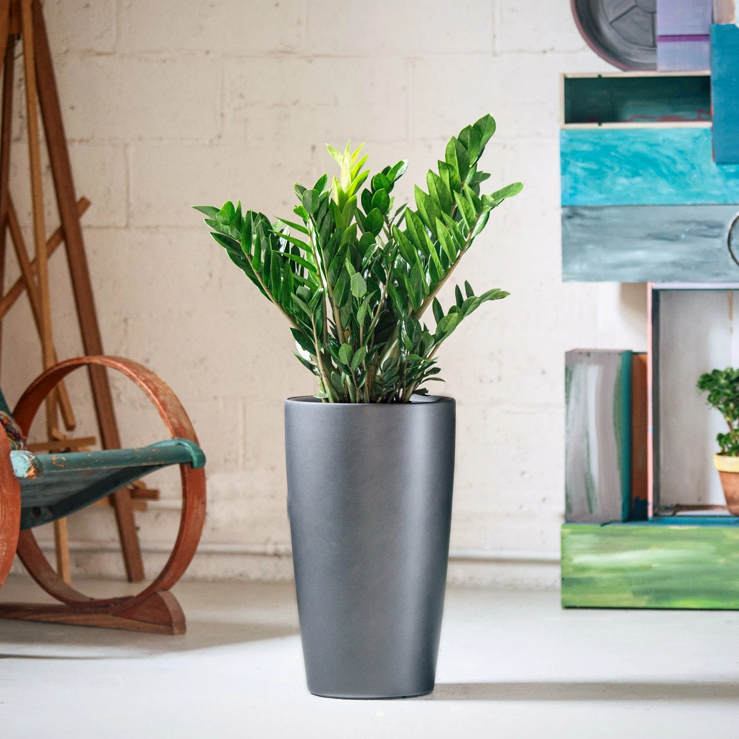 Planter: Built in sub-irrigation system (water your plant 3 times less often in comparison to regular pots). Made by Lechuza in Germany, shatterproof, 100% recyclable plastic. Matte finish.